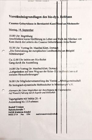Trossen hatte früh erkannt, dass die Bildungsfrage die entscheidende Größe für die Bewältigung der globalen ökologischen Krise ist. Die biodynamische Methode schien ihm die ergiebigste Quelle für die Heilung der Erde zu sein, und so kamen über die Jahre eine Reihe von anthroposophischen Koryphäen zu Vorträgen und Seminaren an die Mosel. In Bernkastel-Kues, wo der bedeutende Gelehrte Nikolaus von Kues 1401 geboren wurde, gab es das Hotel Burg Landshut (heute steht dort das hochwertige Hotel Deinhards) mit einem geistesverwandten Inhaber und passenden Räumlichkeiten für diese Bildungsarbeit.